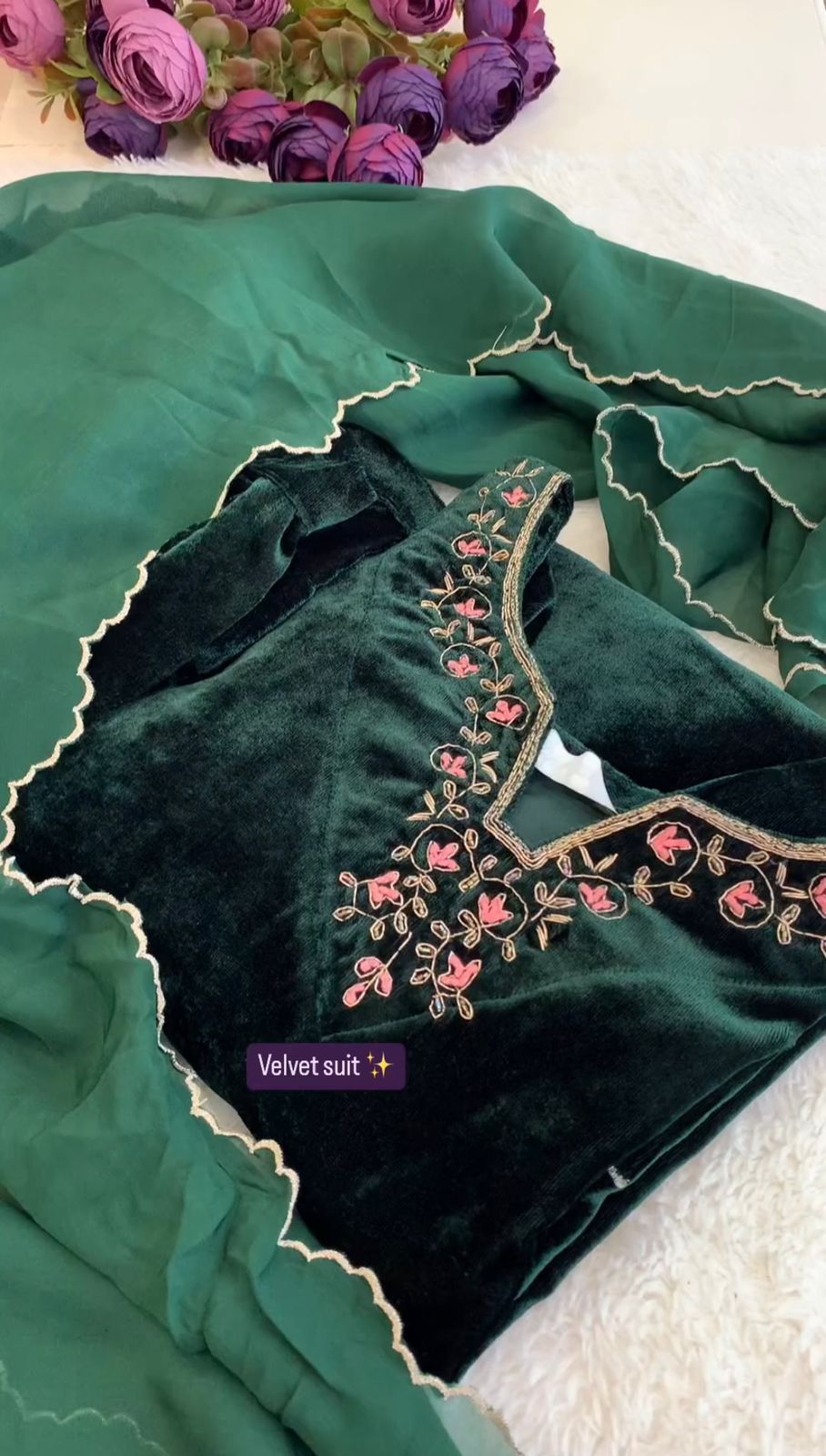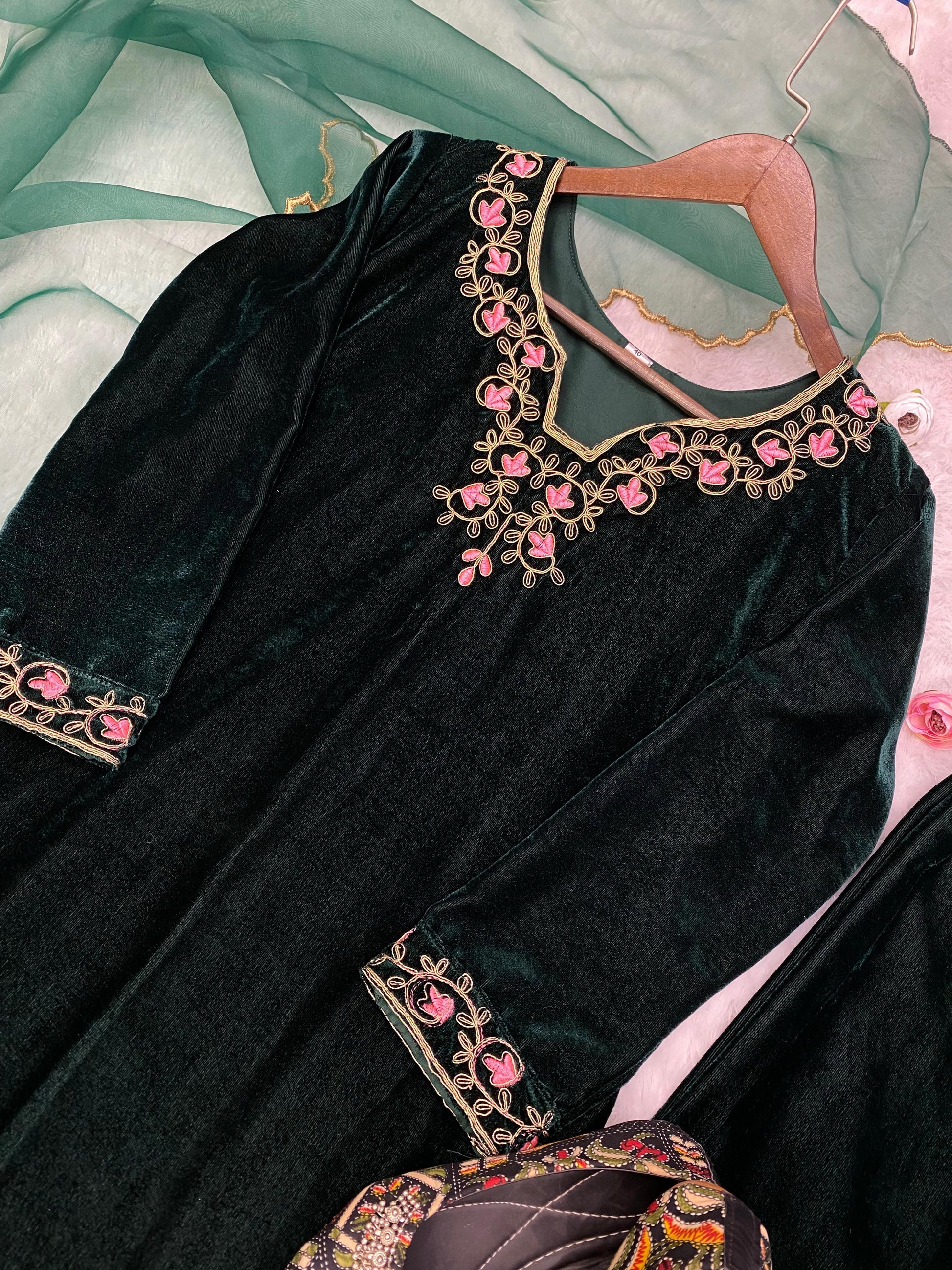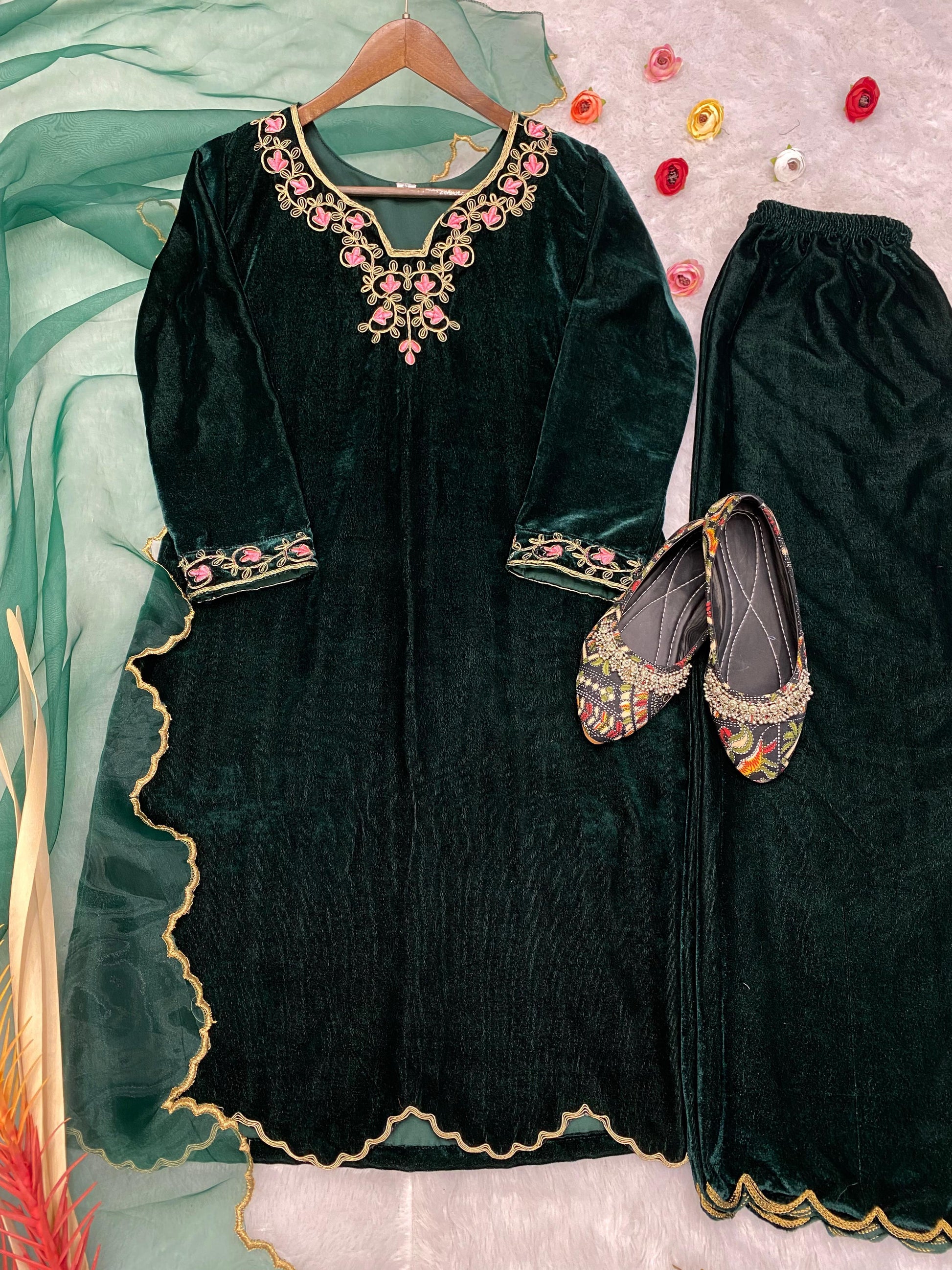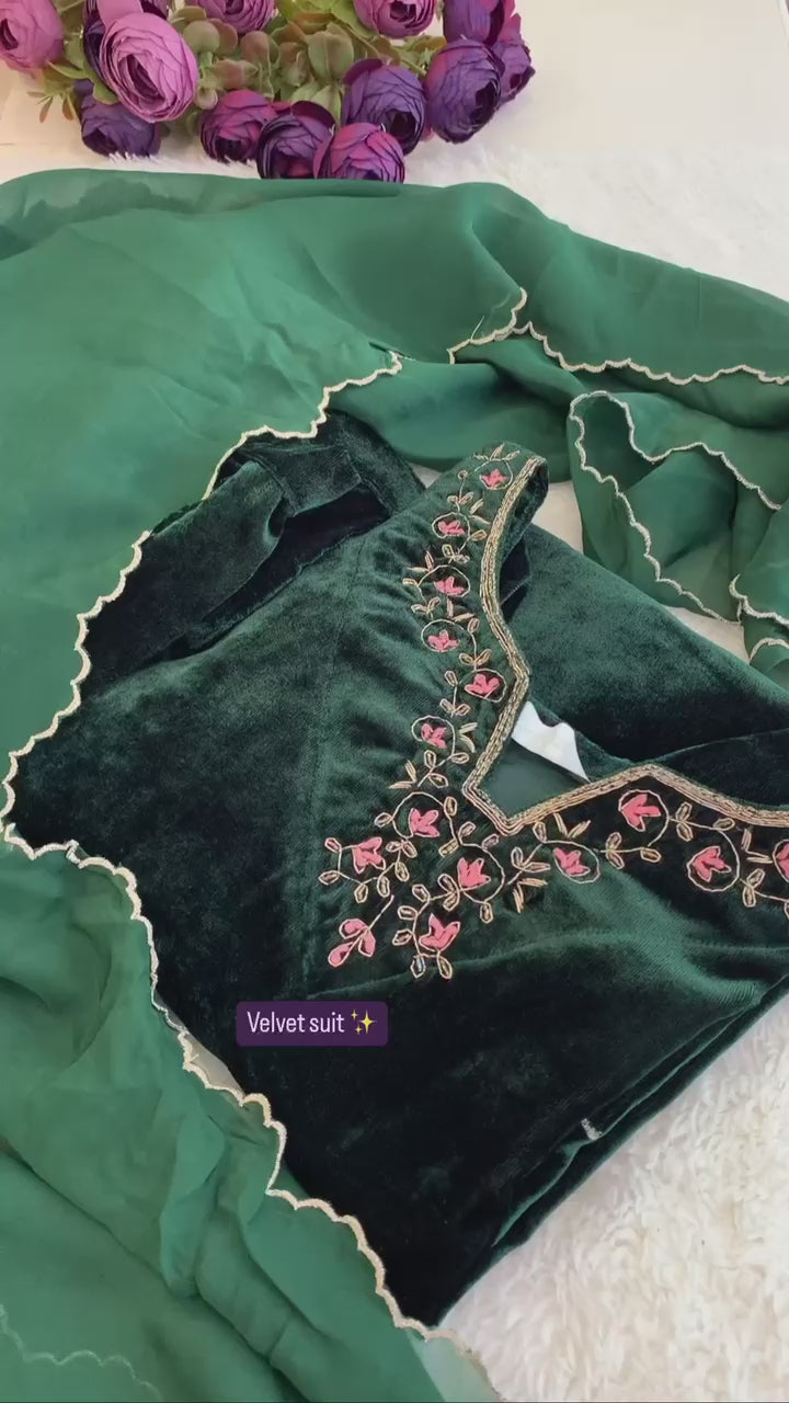 Green Best Quality Velvet Kurti Pent dupatta set for women