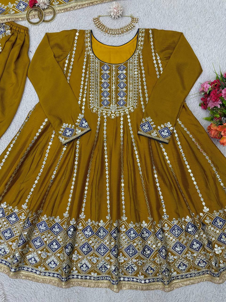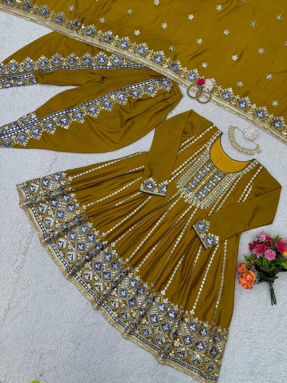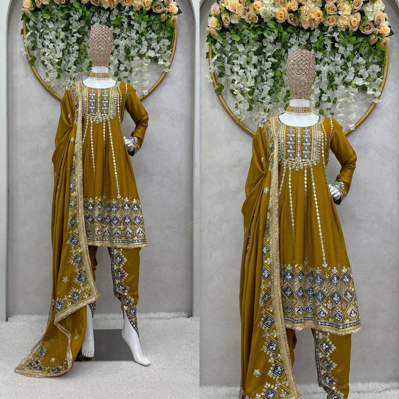 Wedding Wear Mustard Color Chinon Silk Sequence Work Dhoti Salwar Suit
